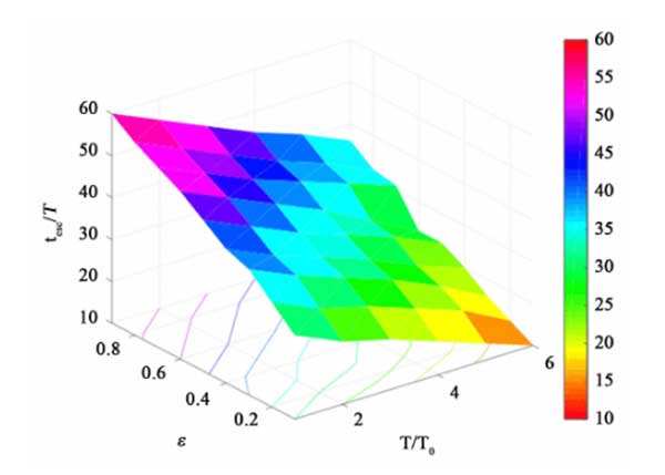 所有參數(shù)空間在孔隙度和溫度方面的綜合研究如圖4所示。我們可以看到,較高的孔隙率和較低的溫度將導(dǎo)致反應(yīng)器中吸附物的停留時(shí)間更長(zhǎng)。較高的溫度會(huì)導(dǎo)致更快的吸附速率,但會(huì)降低活性炭吸附劑的吸附能力。