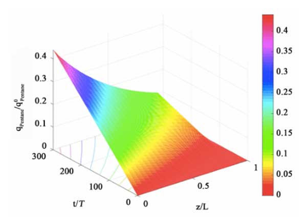 圖5:填充床反應(yīng)器中戊烷在活性炭吸附劑上的載荷的時(shí)空分布。