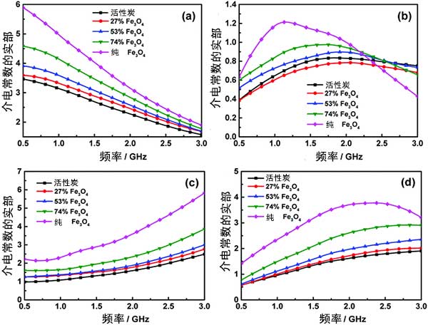 此外,研究了活性炭復(fù)合材料的電磁波吸收性能。圖4顯示復(fù)介電常數(shù)和導(dǎo)磁率,這些電磁參數(shù)對(duì)于確定微波吸收復(fù)合材料的介電和磁損耗非常重要,并且在吸收過程中電磁波的傳輸和反射也受它們的影響。從圖6(a)和(b)中,可以觀察到,所有樣品的介電常數(shù)的實(shí)部與增加頻率。圖6(c)和(d)顯示了磁導(dǎo)率的實(shí)部和虛部作為頻率的函數(shù)。觀察到當(dāng)活性炭的負(fù)載量低時(shí),滲透率的實(shí)部?jī)H略微增加。