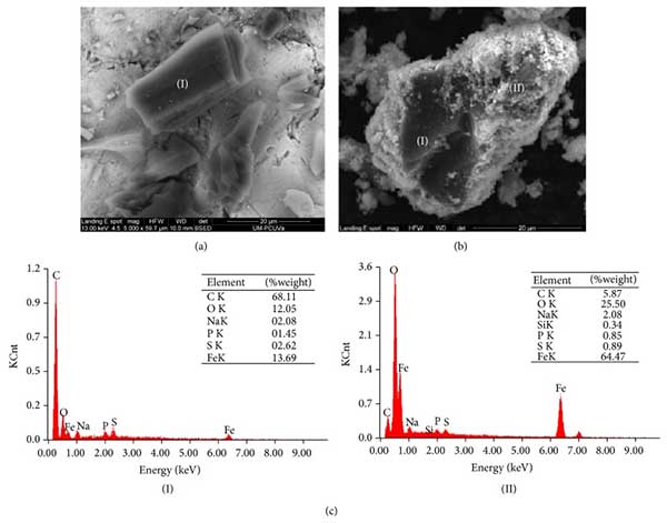 用掃描電子顯微鏡(SEM)對(duì)活性炭的形態(tài)研究顯示了具有不均勻的顆粒的均勻相尺寸大于20 μM(圖2(a))。顯微照片與未經(jīng)改性活性炭進(jìn)行的SEM研究一致。在合成載體的情況下,可以看出活性炭被較小尺寸的相覆蓋(圖2(b))。用能量色散光譜證實(shí)了這一點(diǎn)(圖2(c)),顯示了(I)部分的活性炭含量較大,而區(qū)域(II)的Fe含量較高,因此得出的結(jié)論是磁鐵礦相覆蓋活性炭。