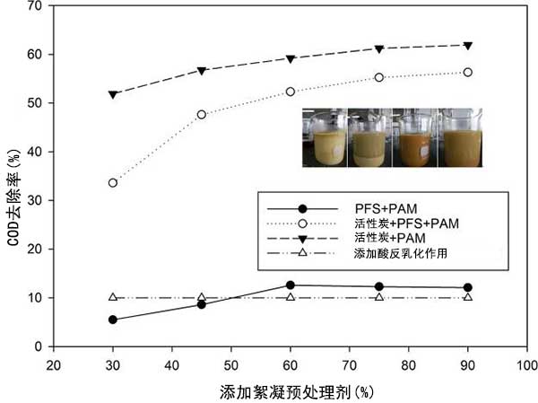 凝結(jié)劑的組合有效地降低了油滴之間的靜電排斥并加強(qiáng)了油和水的分離。凝結(jié)劑的一些組合可以改變油滴上的電荷,產(chǎn)生再穩(wěn)定化或膠體凝結(jié)劑現(xiàn)象,導(dǎo)致切削液COD穩(wěn)定或增加。實驗結(jié)果的分析表明,活性炭+PAM的處理效果比較好。