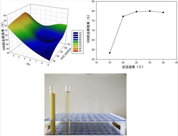 圖2:(a)不同濃度的活性炭對COD去除率的影響的響應(yīng)面,(b)反應(yīng)溫度對COD去除率的影響,(c)絮凝前后水樣的比較。