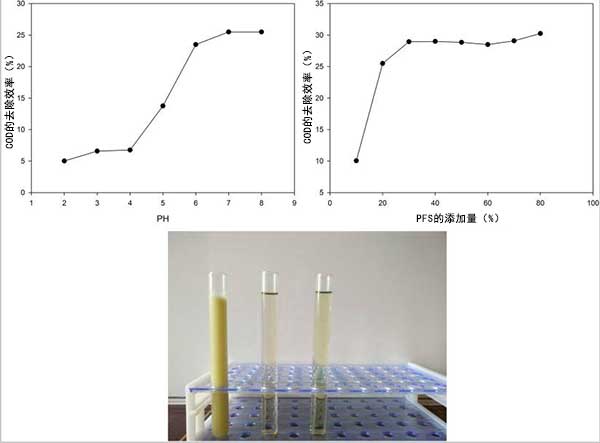 在活性炭負(fù)載鐵離子的初級絮凝預(yù)處理后,濾液含有少量雜質(zhì)。研究了PFS絮凝劑對過濾廢物的影響。使用單因素實驗選擇pH值和PFS添加量(圖3a,b)。原始溶液與初級和次級絮凝后的溶液的視覺比較顯示在圖3c中。