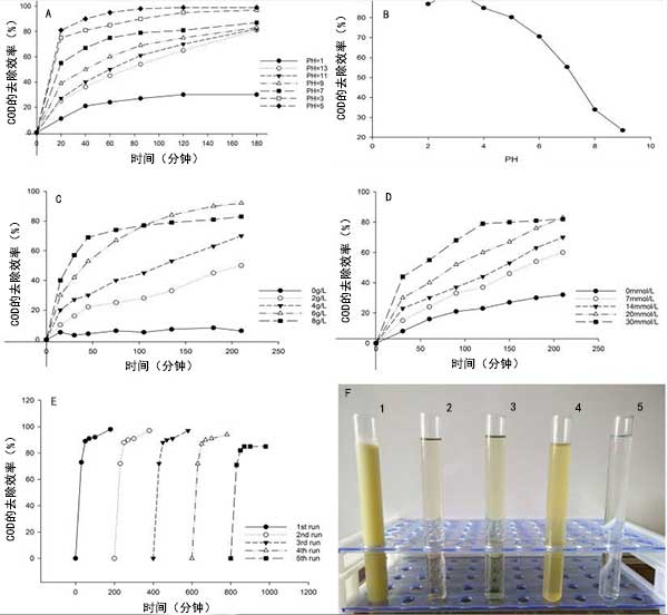 圖4中(a)pH對使用活性炭去除COD的速率的影響,(b)pH對使用傳統(tǒng)方法去除COD的速率的影響,(c)活性炭添加對去除COD的影響,(d)添加H 2 O 2對COD去除率的影響,(e)活性炭在多次運行中的性能,(f)實物圖片中(1)未處理的切削液,(2)初次絮凝后的混合物,(3)二次絮凝后的混合物,(4)傳統(tǒng)處理后的混合物,和(5)活性炭處理后的混合物。