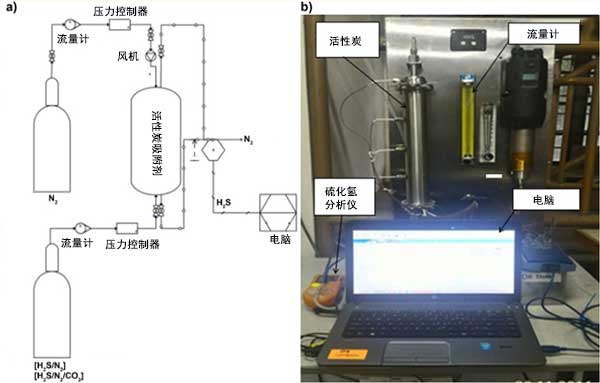 在設(shè)計為0.3米長的實(shí)驗(yàn)室規(guī)模的單吸附塔單元中檢查六種活性炭對硫化氫的吸附性能。每種活性炭的高度指的是不同的活性炭載荷,分別為0.032kg,0.105kg和0.155kg。通過單次進(jìn)料H 2 S/N 2(1000 ppm H 2 S余量N 2)或H 2 S/N 2/CO 2(1000 ppm H 2)的混合氣體觀察吸附性能。圖1(A)和圖1(B)分別顯示了硫化氫吸附系統(tǒng)的示意圖和實(shí)際照片。