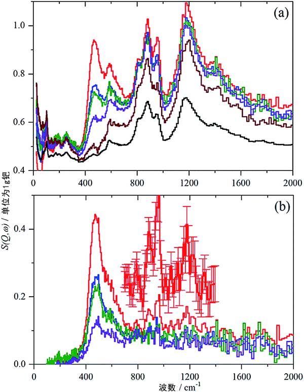 對(duì)于活性炭樣品中的每一個(gè),氫氣在飽和壓力(700毫巴)下記錄IINS光譜,然后逐漸使每個(gè)活性炭脫氫,首先使其在室溫下脫氣不同時(shí)間并且然后在200°C下放置12小時(shí)。圖2顯示了標(biāo)準(zhǔn)化光譜活性炭和活性炭負(fù)載鈀的差異光譜,(a)記錄的標(biāo)準(zhǔn)化光譜,氫氣從上到下在700毫巴下,抽真空至9毫巴,抽空至3毫巴,在200℃下抽真空放置12小時(shí),在200℃下第二次抽真空后放置12小時(shí)的活性炭。(b)減去在200℃下第二次抽空過夜的樣品后的差異光譜,從上到下:氫氣在700毫巴下,抽真空至9毫巴,抽真空至3毫巴,在200℃抽真空放置12小時(shí)后的活性炭負(fù)載鈀催化劑。