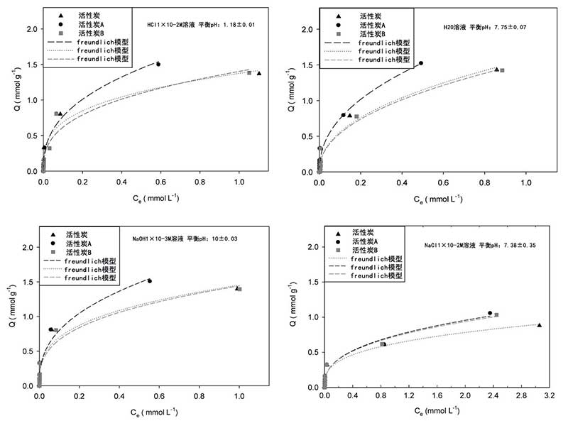 從圖3可以看出,在所有測試的實驗條件下,當平衡濃度較低(即<0.1mmol L-1)時,對羥基苯甲酸甲酯吸附量的差異三種活性炭最小,而對于較高的平衡濃度,活性炭A表現(xiàn)出最高的性能,活性炭和活性炭B具有相似的行為,除非離子強度發(fā)生變化。事實上,在后一種情況下,熱處理樣品顯示出最佳性能并且?guī)缀跸嗨。為了詳細分析檢索到的結果,需要進一步調查,建模分析可能會有所幫助。