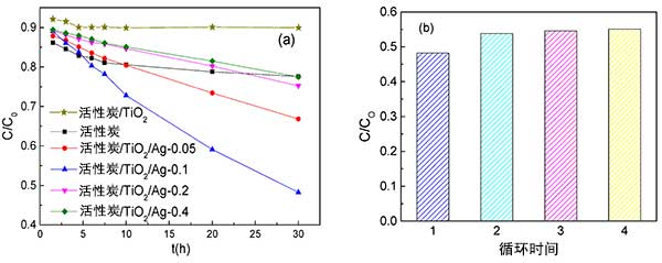 圖2:(a)這幾種活性炭的亞甲基藍(lán)去除效果,(b)經(jīng)歷循環(huán)試驗的活性炭含銀纖維的亞甲基藍(lán)去除效果。