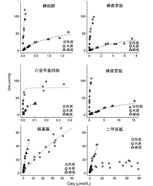 圖1:活性炭對幾種親水微污染物的吸附等溫線。