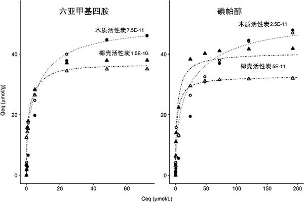 吸附等溫線:進行吸附等溫線以研究所選微污染物對兩種類型活性炭的親和力。所有微污染物對椰殼活性炭表現(xiàn)出更高的親和力(圖1),對木質(zhì)活性炭的親和力一般。椰殼活性炭對某些微污染物的吸附容量可能高在我們的實驗中獲得的數(shù)據(jù),因為施加的微污染物濃度太低而不能達到活性炭飽和。