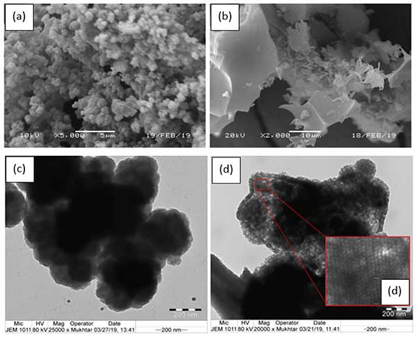 使用SEM,TEM,TGA和XRD分析活性炭的表面形態(tài),熱性質(zhì)和結(jié)晶度。用作活性炭前體的圖像(圖1a,c)顯示其典型的形態(tài)為花椰菜樣結(jié)構(gòu),這種形態(tài)似乎是由于與其中摻雜地嵌入無(wú)序聚合鏈形成的。然而,聚吡咯的球形結(jié)構(gòu)通過(guò)碳化過(guò)程被破壞,導(dǎo)致粗糙,粗糙的表面由不規(guī)則的尖角和剝離狀顆粒組成,在SEM圖像中幾乎沒(méi)有孔隙的跡象。活性炭聚吡咯的TEM圖像如圖1d所示表示觀察到均勻分布的微孔。此外,TEM圖像描繪了高度豐富和對(duì)稱的孔隙,表面積和微孔率的值對(duì)應(yīng)于該活性炭。發(fā)現(xiàn)隨著活化劑用量的增加,表面積增加,孔隙率增加。