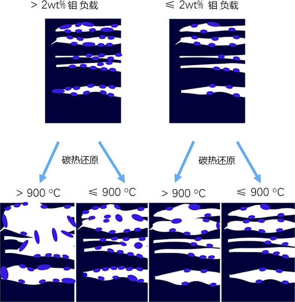 圖4:具有不同鉬負(fù)載和碳熱還原溫度的活性炭的孔發(fā)展過程圖。