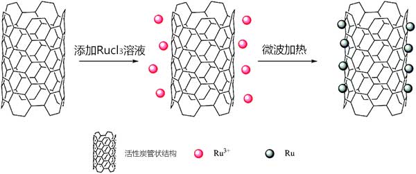 所有載釕活性炭上的釕負(fù)載量理論上為5%。通常,將活性炭加入120mL乙二醇中。并將混合物在超聲處理30分鐘以確;钚蕴烤鶆蚍稚ⅰ3曁幚砗,在連續(xù)攪拌下滴加3.0mL RuCl 3水溶液30分鐘。然后是使用NaOH乙二醇溶液將混合物的pH調(diào)節(jié)至4.0。然后,在連續(xù)攪拌24小時(shí)后,將溶液放入微波合成反應(yīng)器中加熱100秒。過(guò)濾混合物溶液,用去離子水洗滌直至濾液的pH達(dá)到7.0,并在80℃下真空干燥。將樣品研磨成粉末使用。由于活性炭的表面是疏水的,它們傾向于在極性溶劑中聚集。并且由官能團(tuán)改性的活性炭可以提供足夠的孔隙以使釕納米顆粒均勻地分布在活性炭的表面上。在通過(guò)微波加熱的多元醇方法制備活性炭負(fù)載的釕納米顆粒。合成過(guò)程如圖1所示。