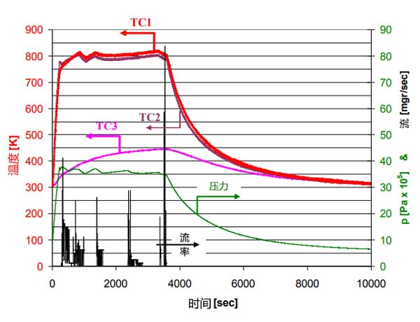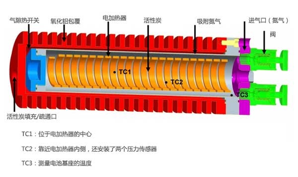 排出壓力約為3.5MPa的實(shí)驗(yàn)結(jié)果如圖4所示。250秒后,加熱功率為500W,中心溫度超過476℃,而電池底座溫度則為76℃。然而,將電池達(dá)到其穩(wěn)態(tài)溫度分布需要大約60分鐘,其中電池基座中的溫度為166℃;钚蕴康臏囟炔辉试S超過526℃。 60分鐘,加熱功率逐漸降低,以保持最高溫度低于526℃,壓力高于3.5MPa。由于電池基座的溫升速率隨時(shí)間降低,輸送的氮量也減少了。因此,在15分鐘后結(jié)束放電階段僅從活性炭吸附池釋放4.6g氮。圖4中的冷卻階段持續(xù)約100分鐘,并且如果放電階段在15分鐘后結(jié)束(此時(shí)基礎(chǔ)溫度僅為126℃),則可以減少冷卻階段。活性炭中的加熱和冷卻速率以及溫度分布與數(shù)值分析估計(jì)的相似。這表明簡(jiǎn)化的數(shù)值傳熱分析為吸附池中的傳熱提供了令人滿意的估計(jì)。