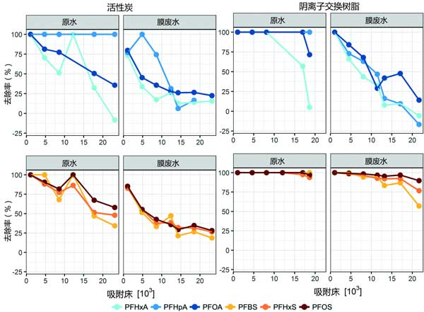 實(shí)驗總計進(jìn)行了12周,每兩周取樣。這導(dǎo)致所有活性炭色譜柱的實(shí)驗運(yùn)行時間為24個,分別處理原水和膜廢水的陰離子交換樹脂色譜柱。在每次采樣之后每周對所有柱進(jìn)行反洗,以模擬典型的全尺寸操作。總共分析了15種全氟烷基物質(zhì),將吸附材料相對于全氟烷基物質(zhì)去除的性能與柱吸附模型的性能進(jìn)行了比較。