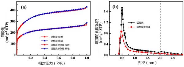 圖2:(a)氮吸附-解吸等溫線和(b)活性炭材料的孔徑分布。