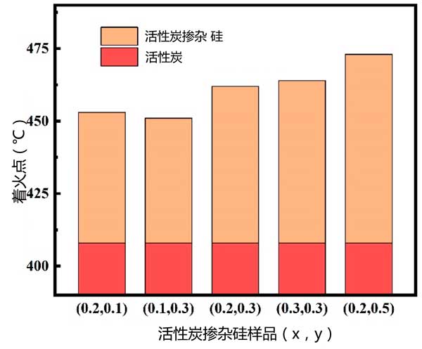 燃點(diǎn):在不同條件下獲得的原料和復(fù)合材料的著火點(diǎn)如圖3所示。觀察到硅摻雜到活性炭中會(huì)使點(diǎn)火溫度升高至少40℃。這種制備活性炭載硅復(fù)合吸收材料的方法有益于改善阻燃性。