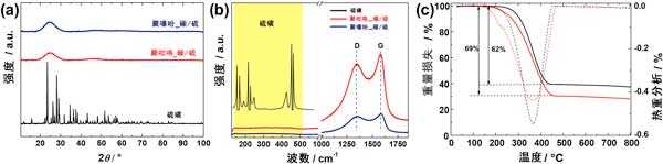 圖3:硫聚吡咯活化的分級碳硫和聚噻吩活化的分級碳硫復(fù)合物的XRD衍射圖和拉曼光譜。