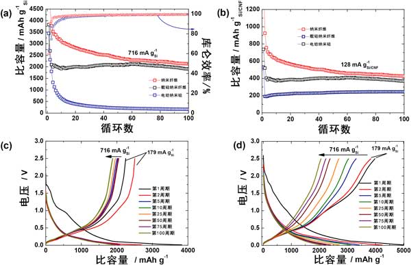 如圖4所示,從第一個循環(huán)的電壓分布中看出,兩個陽極的第一個循環(huán)的額外貢獻(xiàn)來自不可逆的固體電解質(zhì)界面層形成和電解質(zhì)分解。對于電化學(xué)表征,在紐扣電池配置中使用鋰金屬作為對電極對所有硅陽極進行恒電流充電和放電。裸露的十億分之一硅陽極在第一個循環(huán)中提供3445mAhg的放電容量,庫侖效率約為65%。從第二個循環(huán)開始,二氧化硅的硅載納米纖維陰極的比容量值急劇下降至2600mAhg,而納米纖維的靜電紡絲陽極顯示出邊際下降,比容量為4000mAhg-1,庫侖效率均為約91%。比容量的急劇下降可歸因于二氧化硅的硅載納米纖維中的二氧化硅殼在第一次循環(huán)中不可逆鋰化。