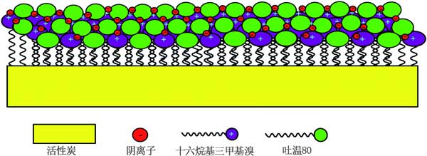 用表面活性劑改性的活性炭在電吸附過程中具有潛在的應(yīng)用,其中表面電荷和潤濕性起重要作用。用離子表面活性劑功能化的活性炭電極最近在電容去離子技術(shù),特別是反向電容去離子系統(tǒng)中引起了相當(dāng)大的關(guān)注。圖3表明在用吐溫80和HDTMA的二元混合物改性的活性炭上吸附陰離子。吐溫80的存在表明HDTMA的吸附密度增強,完美填充(高穩(wěn)定性),這在電吸附過程中都是值得的。實際上,HDTMA的增強的吸附密度誘導(dǎo)了陰離子污染物的高吸附能力。此外,改進的填料賦予表面活性劑在表面上的穩(wěn)定性。這些特殊效果是混合表面活性劑體系應(yīng)用的最終目標(biāo)之一,為了提高活性炭的表面活性,對于單一表面活性劑體系來說,這是不可能發(fā)生的。