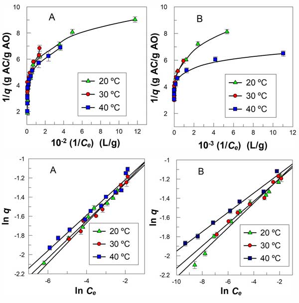 在不同的活性炭量下,評估了溫度(T=20–40°C)對沒食子酸和沒食子酸丙酯吸附過程的影響。實(shí)驗(yàn)吸附平衡數(shù)據(jù)擬合到兩個等溫線模型,Langmuir和Freundlich方程,并評估了擬合優(yōu)度。圖2。在研究的交流范圍內(nèi)獲得了非線性圖。因此,結(jié)果表明該模型不適用于描述沒食子酸和沒食子酸丙酯在活性炭上的吸附。注意,在任何給定的活性炭質(zhì)量下,溫度的變化都會導(dǎo)致沒食子酸和沒食子酸丙酯的吸附能力發(fā)生非常小的變化,差異小于2%。