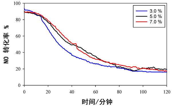 使用活性炭載錳氧化物催化劑時(shí),不同溫度下NO轉(zhuǎn)化率數(shù)據(jù)與時(shí)間的關(guān)系如圖2所示。它用于提供可以與以前發(fā)布的數(shù)據(jù)進(jìn)行比較的基線數(shù)據(jù)。在所有溫度(150°C,180°C和200°C)的前20分鐘內(nèi),幾乎有100%的NO轉(zhuǎn)化發(fā)生,但在此初始階段后NO轉(zhuǎn)化迅速下降,并且在2小時(shí)的測(cè)試后,轉(zhuǎn)化率不足20%;钚缘臏囟纫缽男砸来螢150°C>180°C>200°C。