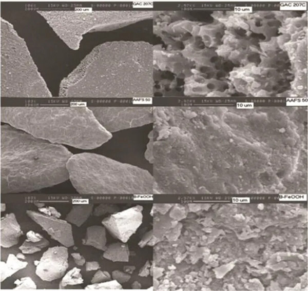 圖2顯示了吸附劑的SEM圖像;钚蕴烤Я5乃毫堰吘壱诧@示出內(nèi)部“孔”。其內(nèi)部結(jié)構(gòu)可以被認(rèn)為是碳板的石墨型分層;罨^程中產(chǎn)生的孔隙和大量碎屑導(dǎo)致了這種吸附劑的易碎性。AAFS晶粒顯示出相同的傾斜形狀,表面看起來光滑且具有均勻的涂層。在更大的范圍內(nèi),僅可見很少的裂縫或孔洞,這表明表面積主要在外部。β-FeOOH的表面具有高脆性,因此表面光滑且?guī)в写罅克樾。多孔結(jié)構(gòu)與SEM照片非常吻合(圖2),說明了活性炭的片狀結(jié)構(gòu)及其眾多的空洞,而鐵化合物則顯得光滑,只有很少的裂紋。活化過程中產(chǎn)生的孔隙和大量碎屑導(dǎo)致了這種吸附劑的易碎性?紤]規(guī)模,中孔和大孔上看到照片(尺寸以上2.5 μ M)。β-FeOOH的表面易碎,因此表面光滑,帶有大量碎屑。該刻度不允許人們區(qū)分赤霞石微晶(FeOOH的β形式)的特征桿雪茄形狀。