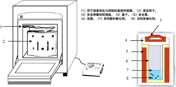 圖1是實驗室設置的示意圖。微波消解實驗站用于產(chǎn)生微波能量。在標準反應運行中,將10 mL異丙醇溶液轉移到100 mL鐵氟龍容器中。在攪拌下將所需體積的過氧化氫溶液(30%)注入到容器中。然后,將一定量的活性炭催化劑添加到該異丙醇溶液中,并在微波消解實驗室站中照射120秒。在所有實驗中,溶液溫度均保持在80±2°C,MW功率保持在600W。