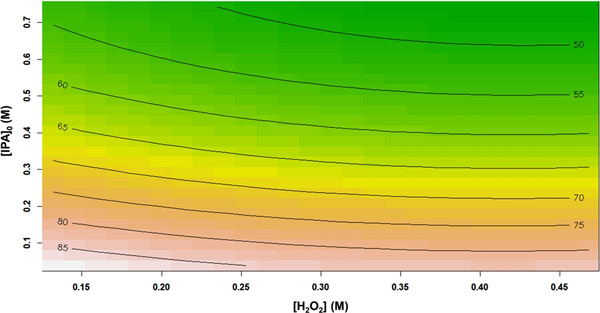 圖2顯示了總有機碳去除效率百分數(shù)與H 2 O 2濃度和初始異丙醇濃度的關系。從響應輪廓中可以看出,將異丙醇初始濃度從0.038 M增加到0.743 M,導致TOC去除率從85.17%急劇降低到46.29%。可能是因為在相同的應用反應條件下,自由基(OH•)的數(shù)量保持恒定,而初始異丙醇濃度卻增加了。換句話說,相對較少量的氧化基團可用于攻擊異丙醇分子。類似地,總有機碳降解性能也隨著H 2 O 2濃度的增加而逐漸降低。過量的H 2 O 2可能促進自動清除反應的發(fā)生。