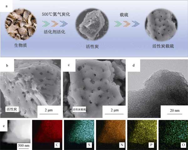 首先,除去生物質(zhì)的污垢和表面雜質(zhì),用清水徹底清洗活性炭原材料,然后用蒸餾水反復(fù)清洗,然后將它們粉碎成碎片,然后在烤箱中100°C下干燥。為了進行預(yù)碳化,將干燥的生物質(zhì)在氮氣氛下的真空管式爐中在500°C的溫度下熱解2小時,以去除少量有機分子。隨后,為了通過化學(xué)活化提高比表面積,將預(yù)碳酸化的生物質(zhì)以1:4的重量比浸入作為化學(xué)活化劑的水溶液中,然后充分攪拌6小時以確保完全滲透。之后,將混合物在N 2下于900°C退火1小時。最后,用鹽酸反復(fù)洗滌退火后的樣品,然后用過量的蒸餾水沖洗以獲得中性pH。最終樣品通過在80°C的空氣中干燥獲得,并標記為多孔活性炭。相比之下,使用相同步驟制備的未添加活化劑的產(chǎn)品被標記為無孔活性炭。接著使用這兩種活性炭升級成加硫復(fù)合材料,將升華后的硫(純度>99.95%)和相應(yīng)的活性炭粉末(重量比為60:40)充分混合并在研缽中研磨。然后,將獲得的混合物用特氟隆容器密封在高壓釜中。在155°C下熱處理12小時后,獲得了多孔摻硫活性炭和無孔摻硫活性炭復(fù)合材料。