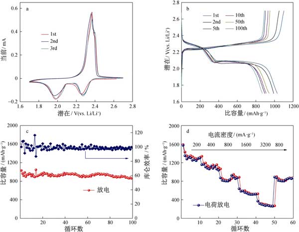 為了評估活性炭作為陰極的電化學(xué)性能,將鋰箔作為陽極組裝到鋰硫電池的紐扣電池中。用于第一,第二和第三個循環(huán)的循環(huán)伏安圖(CV)曲線上在0.05毫伏·秒的掃描速率的電位窗口進行(圖2A)。在第一循環(huán)期間,觀察到兩個陰極峰在2.26和1.97 V,CV曲線中最初的幾個循環(huán)幾乎重疊,這表明循環(huán)穩(wěn)定性極佳,容量保持率相對較高。活性炭的恒電流充電/放電曲線和循環(huán)穩(wěn)定性的測試中,如在圖中所描述2B、C;钚蕴侩姌O的首次放電容量為1045 mAh·g -1,約為硫理論容量的62.5%。此外,活性炭電極在第100次循環(huán)時也顯示出869.8mAh·g -1的放電容量。如圖2d所示測量活性炭的倍率性能,在200–3200 mA·g -1下表現(xiàn)出1260、1050、806、513、290 mAh·g -1的可逆放電容量。此外,當電流密度達到800 mA·g時,活性炭陰極的放電容量為802 mAh·g -1。多孔活性炭材料表現(xiàn)出中等的鋰硫電池電化學(xué)性能,顯示出高性能鋰硫電池的潛力。