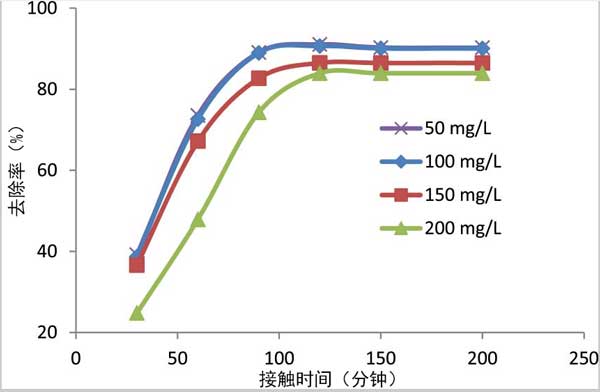 進(jìn)行了兩組實(shí)驗(yàn)以研究苯酚在活性炭負(fù)載納米銀吸附劑上的吸附。進(jìn)行了一組實(shí)驗(yàn)以研究苯酚的初始濃度和接觸時(shí)間對(duì)活性炭負(fù)載納米銀吸附劑對(duì)苯酚吸收的影響。這是通過改變初始濃度(50–200mg/L)和接觸時(shí)間(30–200min),同時(shí)分別將吸附劑量和攪拌固定在0.2g和200rpm上來實(shí)現(xiàn)的。另一組實(shí)驗(yàn),用來確定活性炭吸附劑的最大程度吸收苯酚的工藝參數(shù)。在這里,選擇的因素包括初始苯酚濃度,接觸時(shí)間,吸附劑劑量和攪拌速率等。