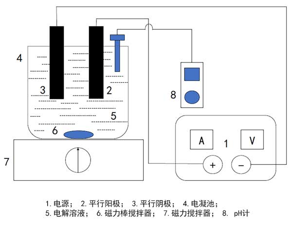 目前尚不知道電凝是否可以與活性炭吸附結(jié)合使用,作為從礦井廢水中去除硫酸鹽的可行新技術(shù)。所以我們來測試一下如圖1所示,使用有機(jī)玻璃反應(yīng)器在720mL電凝電池(12×10×6cm)中進(jìn)行活性炭吸附過程。鋁(純度≥99%)用作犧牲電極,不銹鋼用作陰極。每個(gè)電極板的有效面積為20cm2。平行的陽極和陰極垂直放置,并隔開一定距離。電極連接到數(shù)字直流電源,電壓和電流范圍分別為0-50V和0-5A。每次運(yùn)行前,電極用細(xì)砂紙磨擦,先后用0.2M HCl和蒸餾水洗滌。對于每個(gè)實(shí)驗(yàn)運(yùn)行,將600mL礦井水放入電凝反應(yīng)器中。使用磁力攪拌器不斷地(200rpm)攪拌溶液。將電流密度,電極間隙,初始pH和反應(yīng)時(shí)間設(shè)置為期望值。通過添加0.1M HCl或0.1M NaOH來調(diào)節(jié)pH,并使用pH計(jì)進(jìn)行測量。所有運(yùn)行均在室溫(20°C)下進(jìn)行。