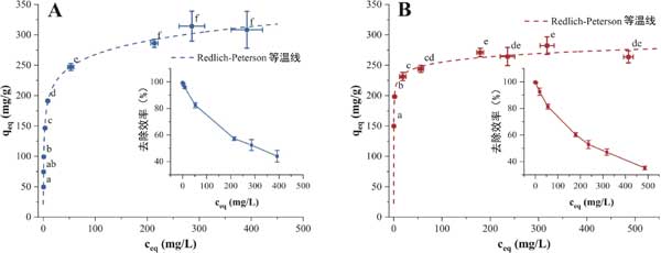圖2:在(A)欖殼活性炭(B)活性炭上進行羥基酪醇吸附的吸附等溫線的實驗數(shù)據(jù)。