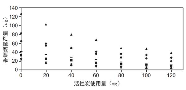 測(cè)試過(guò)程中我們?cè)跓o(wú)炭和以20毫克至120毫克的六種重量增量添加活性炭來(lái)測(cè)試香煙。桿端和嘴端的醋酸纖維素長(zhǎng)度段始終保持恒定。最大的空腔填充值用于所有負(fù)載,因此,總的過(guò)濾器長(zhǎng)度增加了約50%。每使用15毫克活性炭增加1毫米。如前所述,所有香煙都在35/2/60的條件下進(jìn)行調(diào)理和抽煙。每個(gè)濾嘴負(fù)載量高為120mg時(shí)添加活性炭對(duì)焦油和尼古丁的收率(即顆粒相)的影響很小,這可能是由于較長(zhǎng)的濾嘴導(dǎo)致了額外的機(jī)械過(guò)濾。對(duì)于所有測(cè)得的蒸氣,隨著活性炭載量的增加,產(chǎn)率都有所下降。這在圖1中以圖形方式顯示(僅出于清晰目的使用一定范圍的蒸氣),其中乙醛/丙酮值乘以0.1以進(jìn)行縮放。
