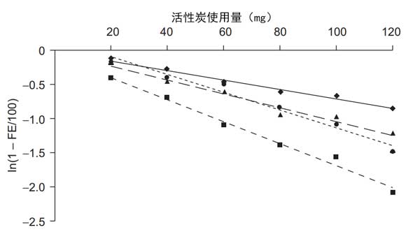 我們測(cè)試了增加活性炭微孔體積的效果,以及中孔和大孔的添加。對(duì)煙氣量的影響,在圖3中進(jìn)行了描述。從圖可看出,增加微孔的數(shù)量會(huì)導(dǎo)致更大的吸附并因此降低煙氣的產(chǎn)生。中孔/小大孔的加入通過(guò)改善向微孔的運(yùn)輸而導(dǎo)致吸附增強(qiáng)。很明顯,使用微孔/中孔活性炭會(huì)導(dǎo)致速率常數(shù)的增加,通常增加了約20倍。