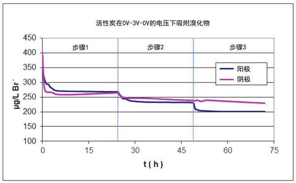 圖4:在三步實驗中的溴化物濃度,第二步對應(yīng)于在3V下進(jìn)行24h的陽極和陰極電吸附實驗。在第二步中施加3V電壓24h,然后將其再次置于開路狀態(tài)24h。