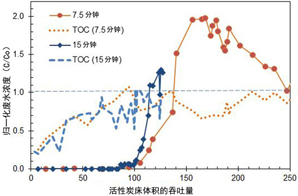 空床接觸時間對突破的影響說明如下:圖2用于123-三氯丙烷。盡管7.5分鐘和15分鐘EBCT的123-三氯丙烷突破的開始是相似的,但在100,000床體積之后,與7.5分鐘EBCT相比,15分鐘EBCT的突破更早。更長的EBCT容量降低可能是活性炭結(jié)垢的結(jié)果,這是由于更強的吸附力和不可置換的DOM到達吸附床的更深處,并超過了目標(biāo)有機物的吸附位點和/或覆蓋了活性炭顆粒的孔而導(dǎo)致的。時間并防止進一步的目標(biāo)有機物吸附。通過比較相似突破點的吞吐能力差異,說明了EBCT對其他cVOC的活性炭性能的影響,其中負值表示在15分鐘EBCT時容量更大,正值表示在7.5分鐘EBCT時容量更大(或在15分鐘EBCT時容量較小)。床體積數(shù)量達到突破的10%,50%或75%的平均容量差異(不包括VC,因為未評估15分鐘EBCT)分別為-0.1%,9%和13%,表明在運行時容量沒有損失。15分鐘的EBCT突破了10%,突破了適度的容量,因為更長的EBCT結(jié)垢了,因此突破了50%和75%。