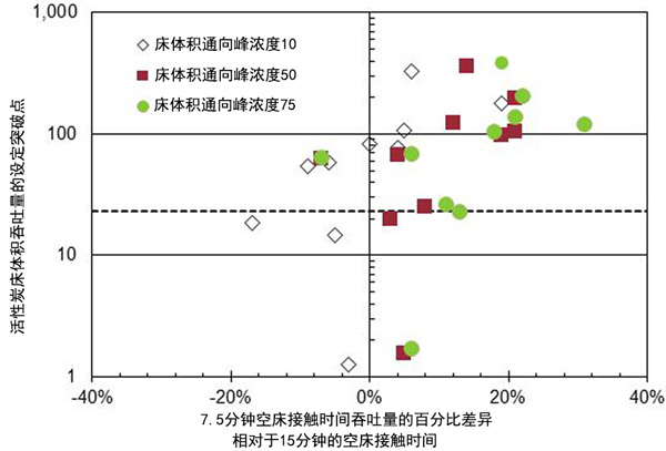 圖2:空床接觸時間對吞吐率的影響達到10%,50%和75%的突破。