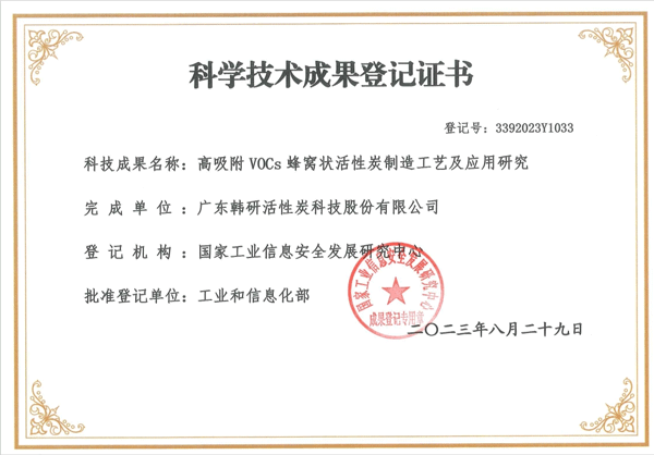 本次科學技術成果鑒定由國家工業(yè)信息安全發(fā)展研究中心依據《中華人民共和國科學技術進步法》、《中華人民共和國促進科技成果轉化法》、《科學技術評價辦法》、《科技評估管理暫行辦法》,在北京主持召開由韓研股份研發(fā)的“高吸附 VOCs 蜂窩狀活性炭制造工藝及應用研究”科技成果評價會。期間嚴格按照《科技成果評價試點暫行辦法》的有關規(guī)定和要求,秉承客觀、公正、獨立的原則,聘請專家對該項科技成果進行評價。評價委員會聽取了項目完成單位的技術總結報告,對評價資料進行了審查,經嚴格質詢和充分討論形成一致意見:本技術成果達國際先進水平。